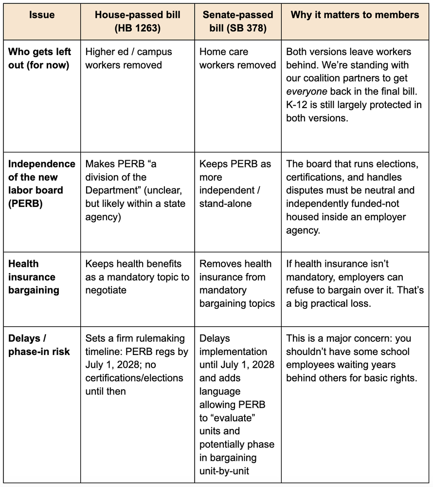 The House (HB1263) and Senate (SB378) have each passed their own version of a statewide collective bargaining bill. The bills are similar in many ways, but are no longer identical. Over the next few weeks, lawmakers will negotiate a final version that will make its way to Governor Spanberger.